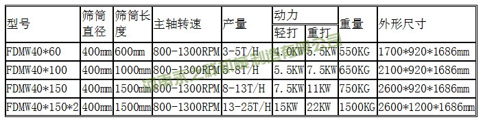 1、打板转子热处理,寿命长。2、筛筒特别结构及特殊处理并保证寿命长。3、根据不同工艺要求可分为重打和轻打。主要技术参数