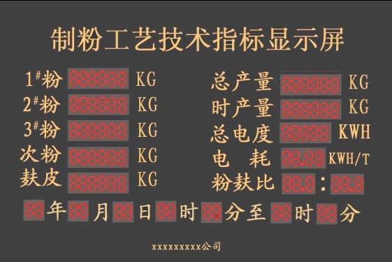 1.面粉生产工艺中的产量、出粉率、电耗等是重要的经济技术指标。为使生产人员和管理人员实时掌握上述各项指标,指导生产操作和工艺调整,争取*大经济效益,公司研发了《制粉工艺技术指标实时显示屏》。
